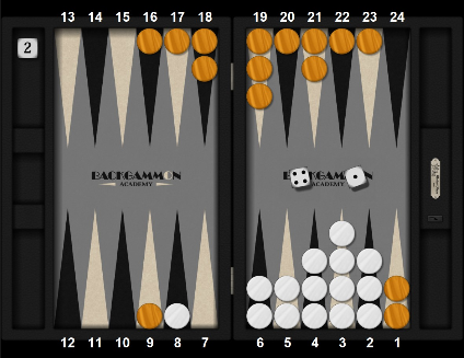 Nou dominons cette partie et pouvons la remporter par gammon. Notre seul objectif est de ne pas nous faire frapper et de jouer la sortie des pions (i.e; beor-off) de manière idéale.